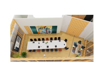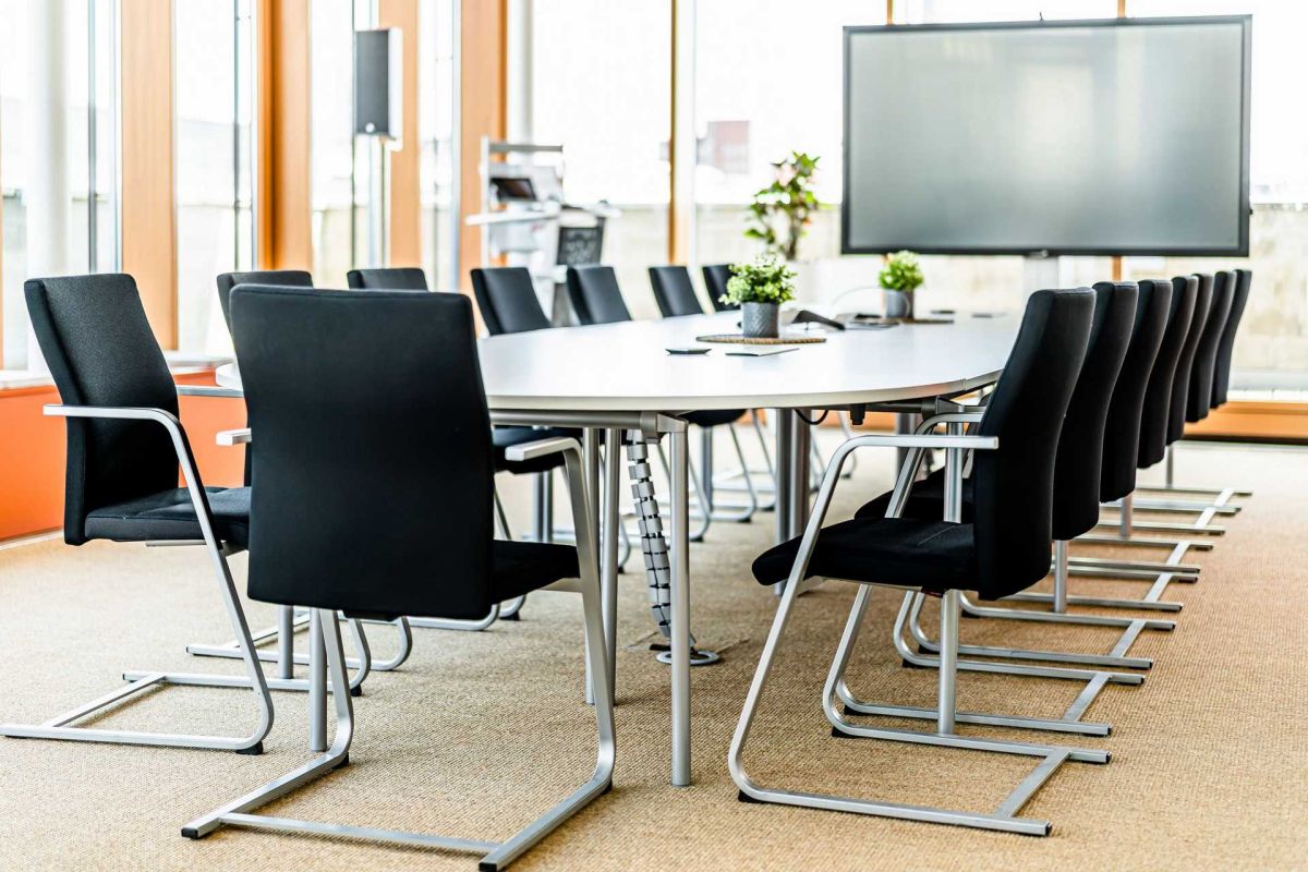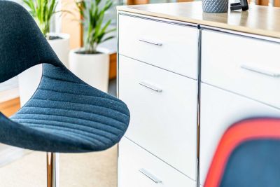 Der Sitzungssaal erscheint nun auch in modernem Design und ist flexibel nutzbar. Durch die stabilen, klappbaren Tische kann das Mobiliar von einer Konferenztischlösung einfach und schnell zu einer Schulungssituation umgebaut werden. Ideal für die sich ständig ändernden Anforderungen. Eine Hochtischkombination mit integriertem Kühlschrank ergänzt den Raum und sorgt für eine unkomplizierte Catering Lösung in unmittelbarer Nähe.